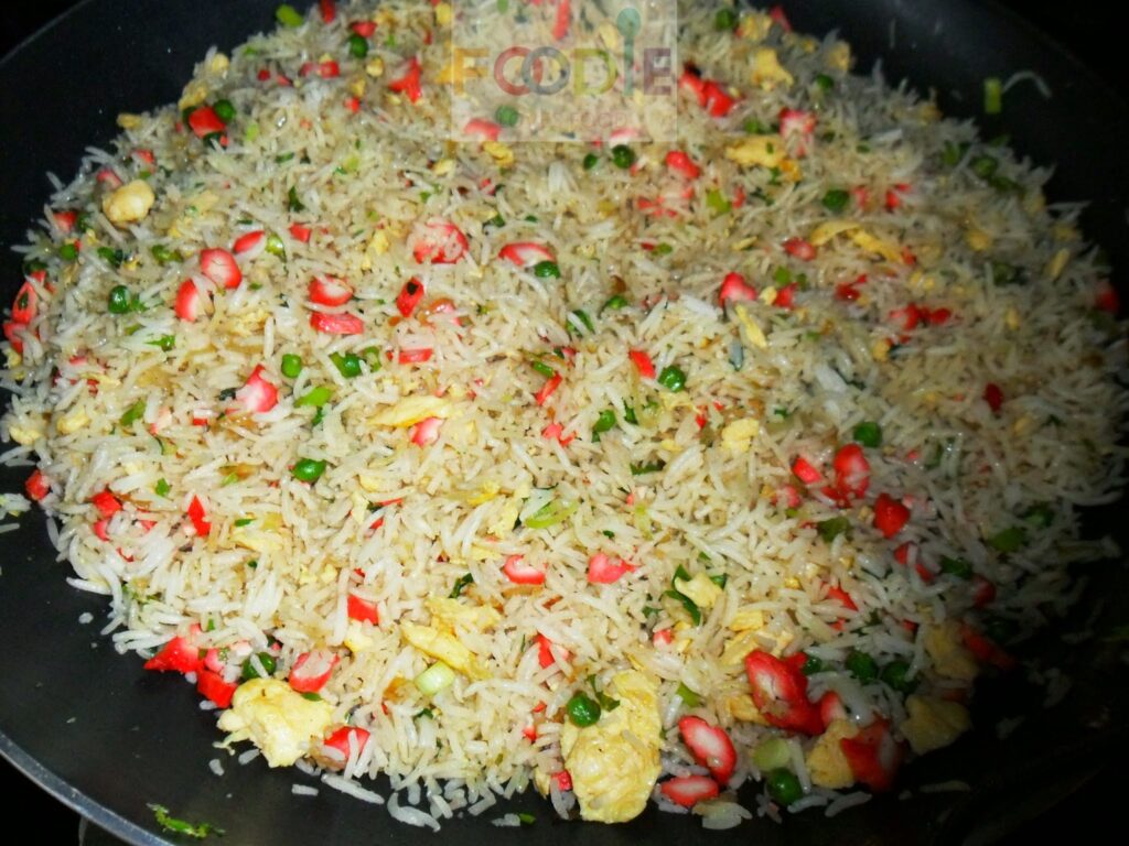 • Hierna mag de rijst en het ei erbij. Schep het even om en vervolgens mag de lente ui en selderij erbij.