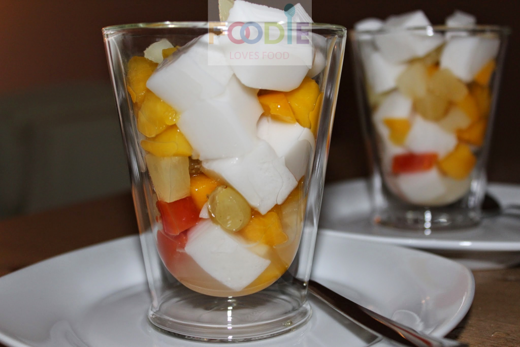 Misschien niet een van de meest elegantste dessert die je kunt bedenken, maar wel een van de lekkerste en lichtste. Ideaal voor na een zware maaltijd, tevens staat dit ook leuk in kleine bekertjes op je buffettafel. Een ware tropische verrassing die makkelijk te maken is en zeer simpel voor te bereiden, je kunt deze pudding al ruim een dag van tevoren maken en lekker in de koelkast laten opstijven. Overigens is dit een vegetarische versie van de pudding, voor de meeste puddingsoorten wordt gelatine gebruikt, dit wordt gemaakt van beenderen van rund of varkens, en hierdoor is dit niet geschikt voor vegetariërs. Agar agar is echt gemaakt van zeewier, waardoor het puur plantaardig is. Tevens bindt agar agar al bij een temperatuur van 45 graden. Agar agar is te koop in verschillende kleuren, ik heb nu gekozen voor de witte variant want dat vind ik beter passen bij de kokossmaak. Maar je kunt dit natuurlijk maken in vele kleuren zoals, rood, groen of onder andere bruin.
